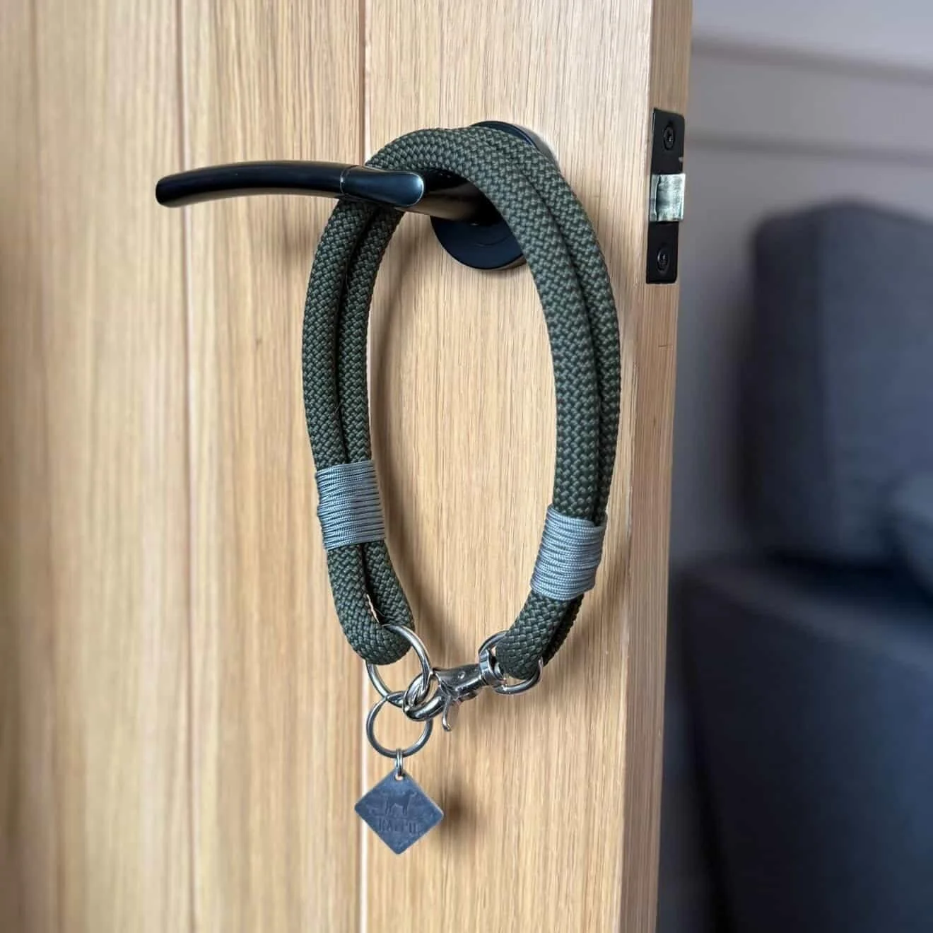 Handcrafted from strong double 12mm khaki green paracord, The Ralph features subtle grey whipping for added reinforcement and a touch of understated style. Silver hardware completes the design with a sleek, classic finish that is both practical and elegant.