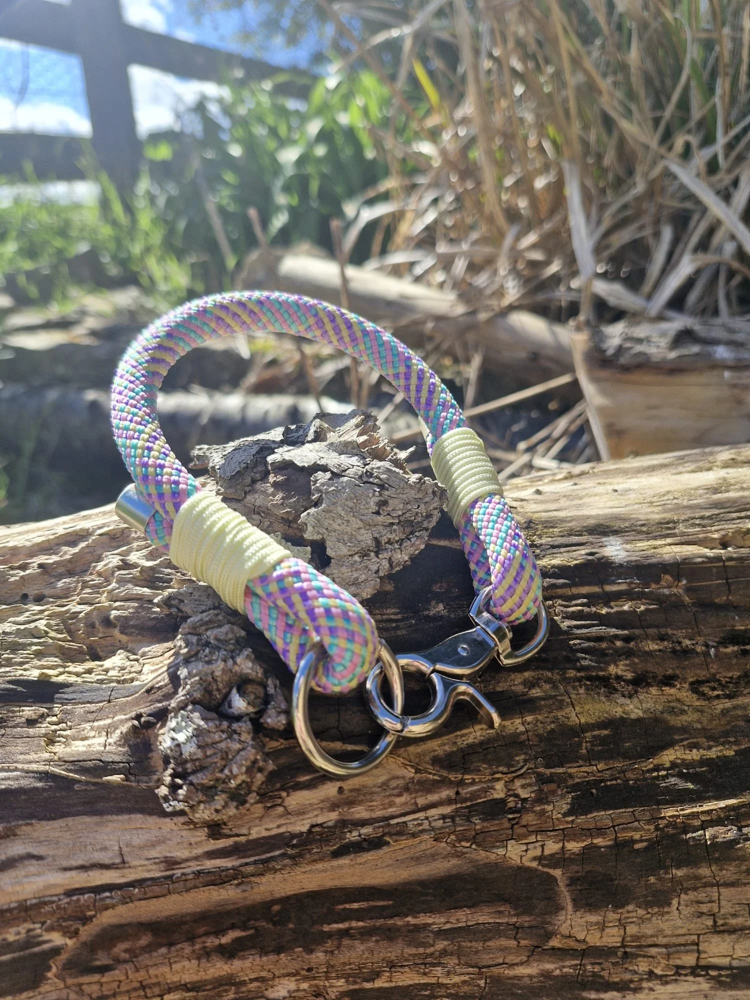 Handcrafted from a single strand of durable multicoloured pastel paracord, this collar combines strength, comfort, and style. The beautiful blend of spring tones creates a bright yet elegant look, while your choice of whipping colour and hardware finish allows you to customise the final details to suit your pet perfectly.