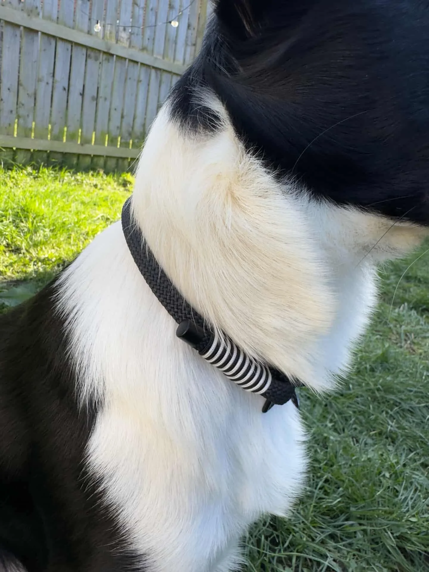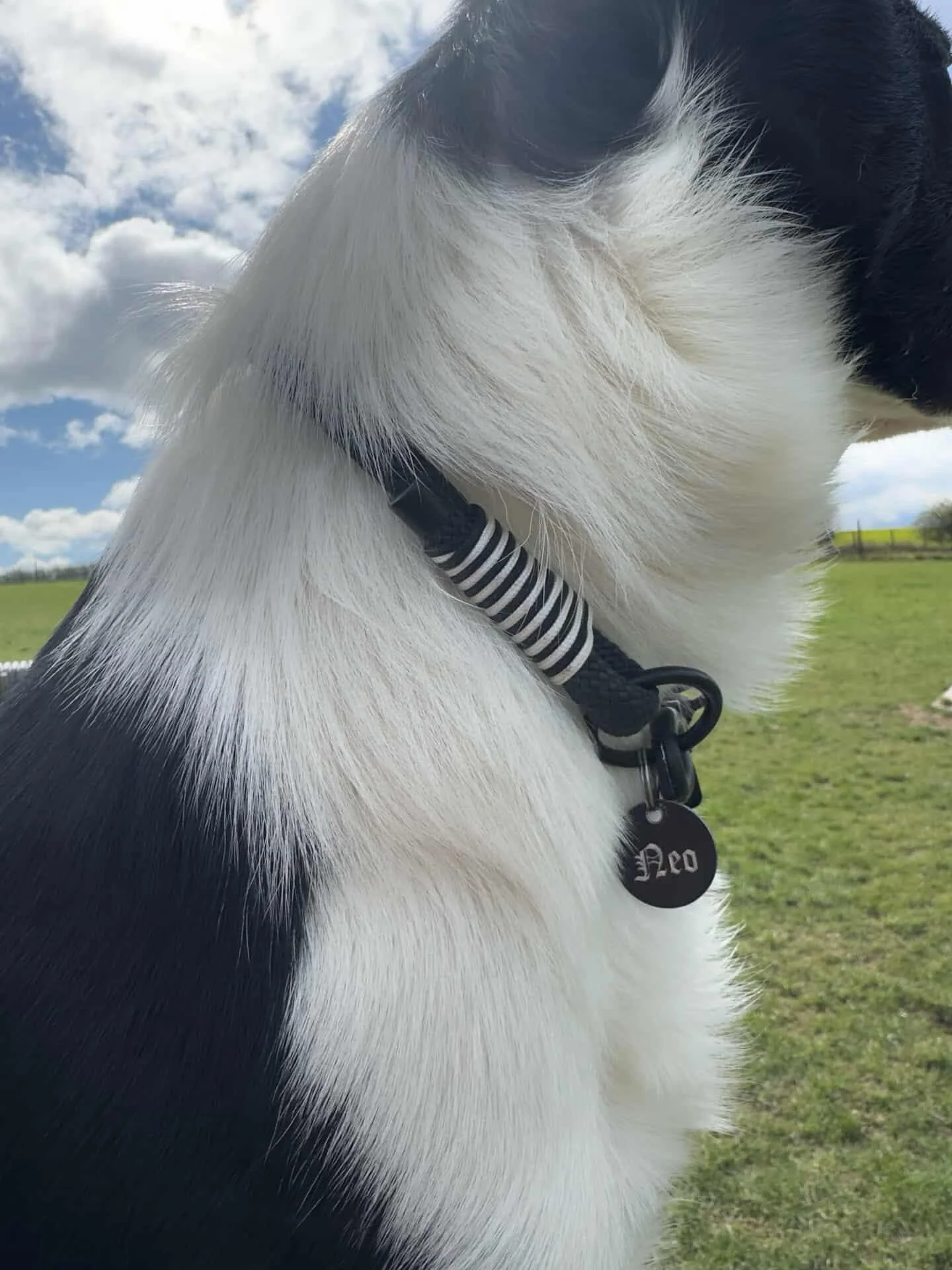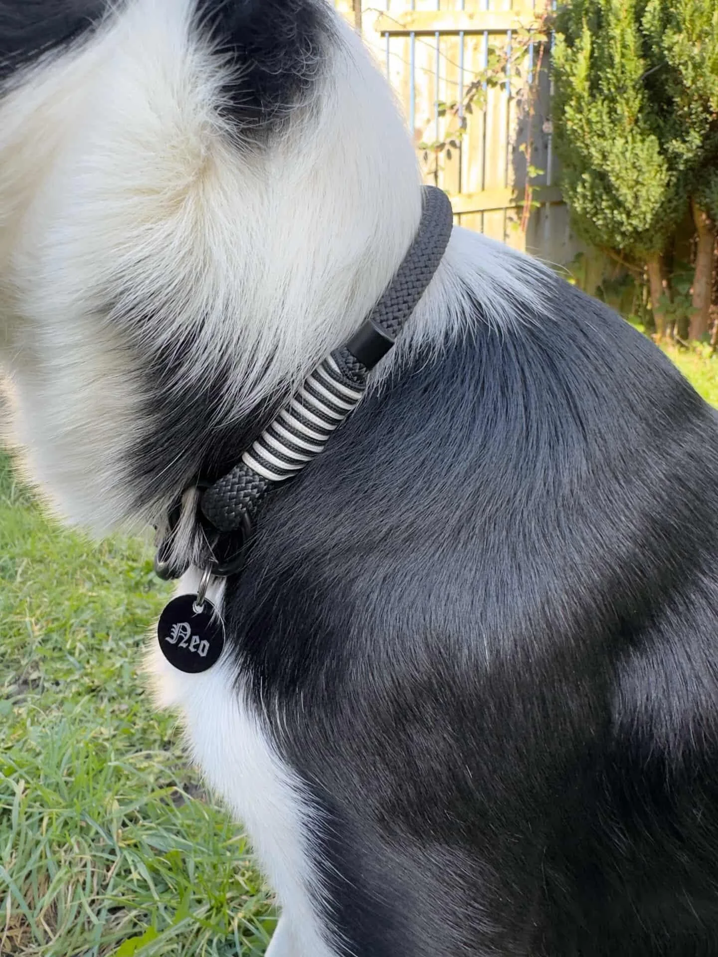 Handcrafted from durable black paracord, this collar features a clean black and white whipping pattern as a nod to Neo’s distinctive coat, finished with sleek black hardware for a bold, modern look. Built for both performance and everyday wear, it's strong enough for active dogs who love sports like flyball and agility, while still looking stylish on everyday walks.