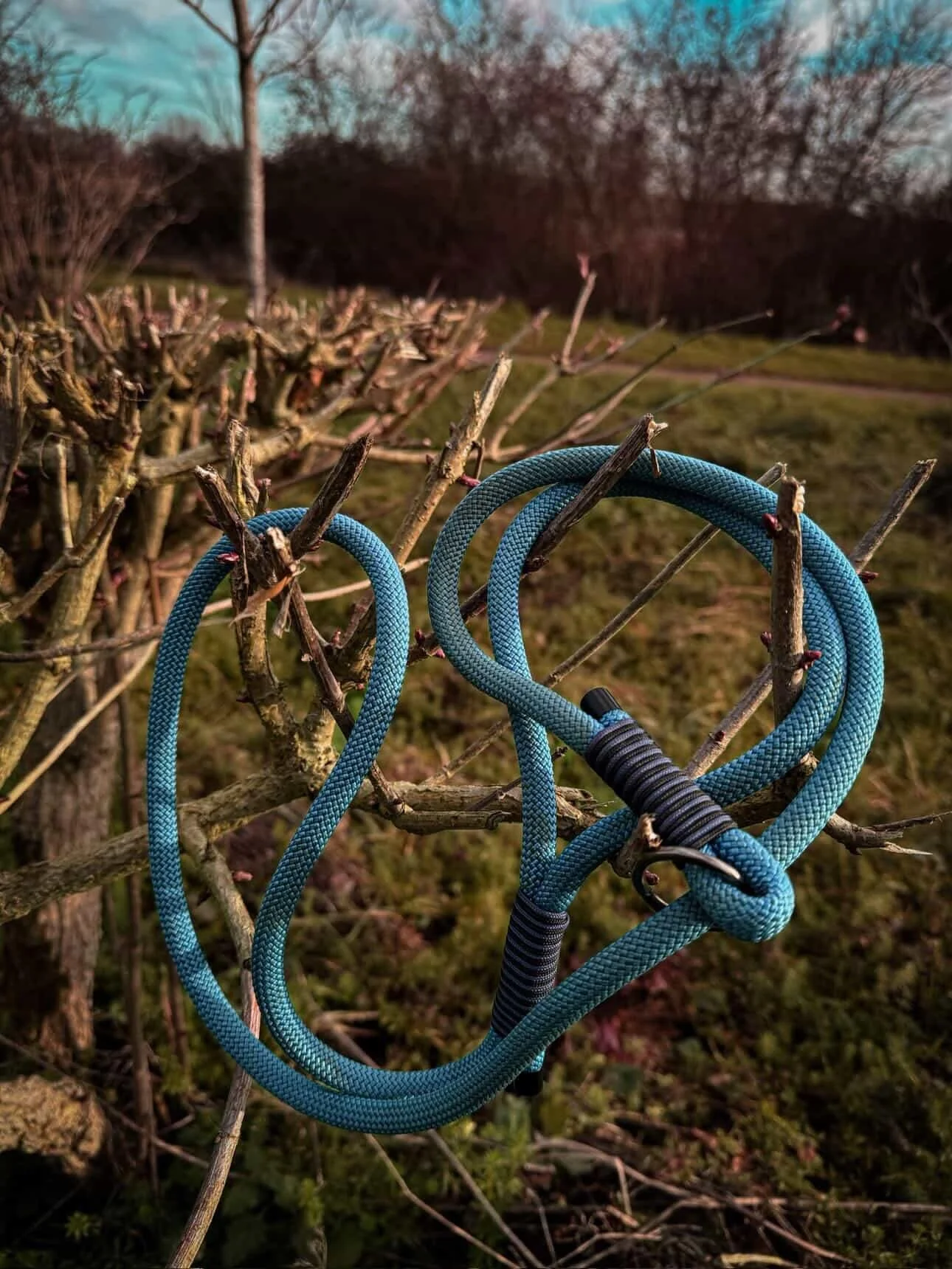 Handcrafted from durable 10mm petrol paracord, this slip lead is perfect for training sessions, woodland walks, or everyday outings. The dark blue and black whipping adds reinforcement and subtle contrast, while the black fittings give a classic, heritage finish.